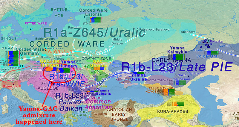 Yamna migrants ca. 3300-2600. [Most likely site of admixture with the described “GAC (Globular Αmphorae Culture)-like population” circled in red.]